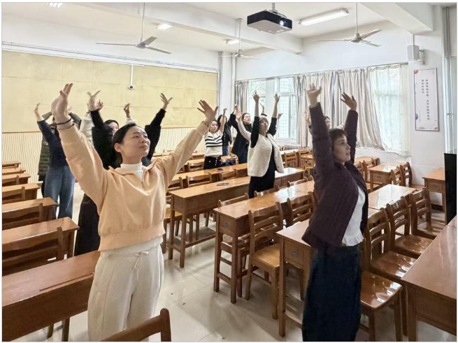 活动伊始,全体女教职工齐聚陶然楼6206教室,参与《立春》肩颈放松课桌舞学习。结合教职工久坐办公的工作特点,学院舞蹈教师进行专业指导,带领大家跟随温柔旋律分步练习,重点活动颈、肩、背等易劳损部位。轻柔的律动有效舒缓了日常工作疲劳,轻松的互动进一步拉近了同事间的距离,现场洋溢着欢乐祥和的节日氛围。