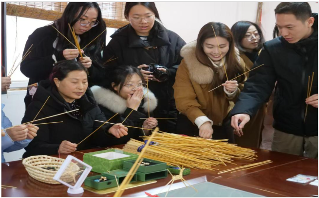 活动首站来到桥南镇巧娘草编专业合作社,参观陕西省非物质文化遗产——“临渭草编”主题展览,深入了解渭南草编的历史渊源与工艺特色。在草编专业合作社社长、非遗传承人、陕西省劳动模范——陈春苗手把手教学下,大家分组动手编织,在穿绕编结间完成专属草编作品,真切体会传统手工艺的魅力,加深对中华优秀传统文化的理解与认同。学院与巧娘草编专业合作社签订教学实践、学生就业、劳动教育基地协议。